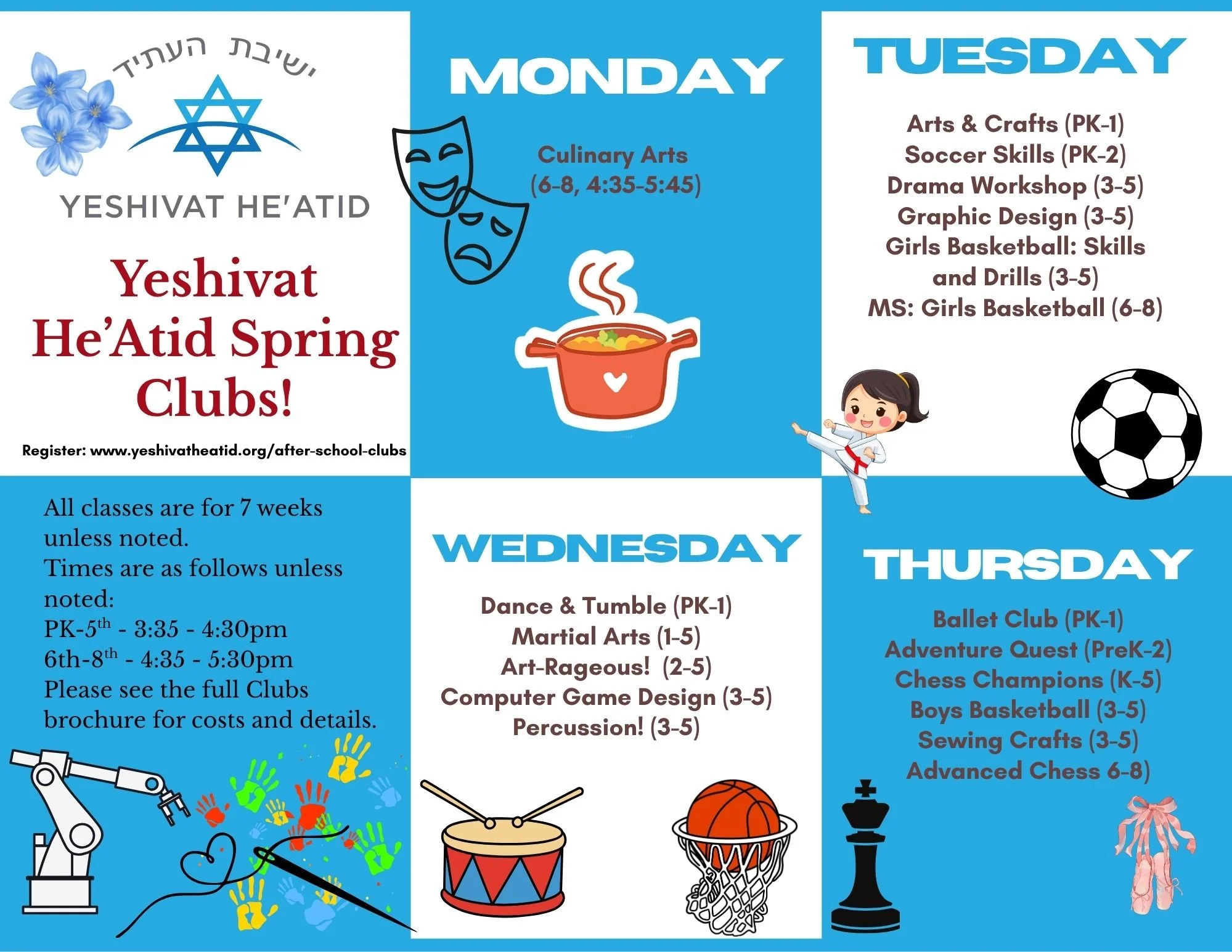 Yeshivat He’Atid is excited to announce the new semester of the After-School Clubs. This semester, we offer clubs for Pre-K through 5th grade from Tuesday through Thursday, and clubs for Middle School on Monday, Tuesday and Thursday.